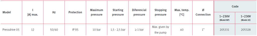 Assembled on a pump, automatic start and stop based on water demand. Adjustable starting pressure range from 1,5 to 2,5 bar. In-Line pump-pipe connection.